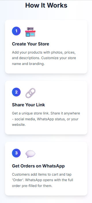 WhatsApp store creator for small businesses in emerging markets (India, Indonesia). Built through vibe coding - rapid iterations and shipping features as they were thought of.